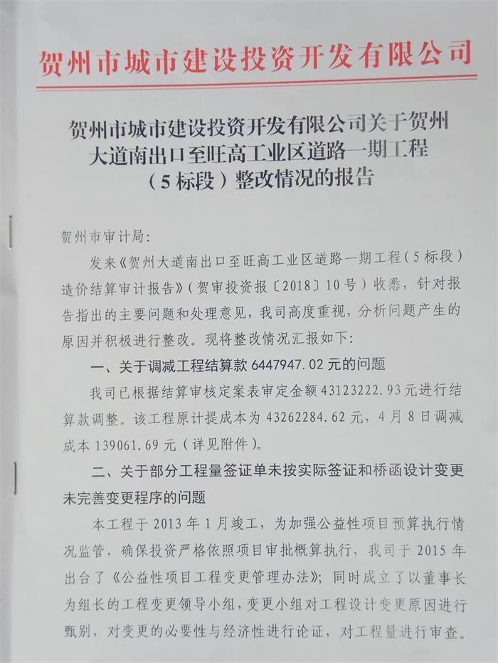 附件一:關(guān)于賀州市靈峰大橋工程建設(shè)項(xiàng)目竣工決算審計(jì)整改情況的報(bào)告 pdf